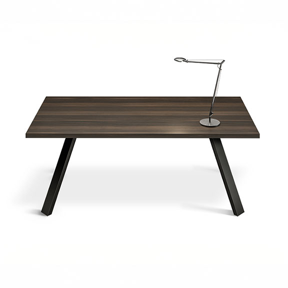 The inclined metal structure, a distinctive feature of the design, gives the table a solid yet visually dynamic presence, capable of adding character to the environment without weighing it down. The melamine top completes the composition with a functional and elegant surface, creating a harmonious balance between technical precision and aesthetic care.