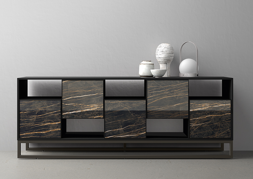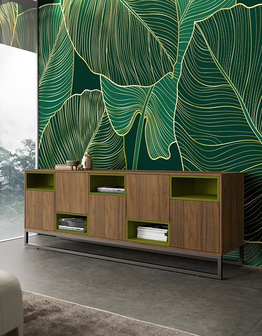 La base metallica si combina alla struttura esterna in legno per creare uno scheletro portante, all’interno del quale poter inserire moduli a giorno o con anta in numerosi materiali e finiture, per creare abbinamenti originali e contrasti eleganti.
