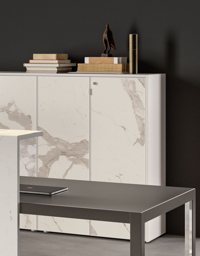 Il contenitore propone infinite varianti di finiture grazie alle differenti soluzioni di ante, valorizzando l’estetica dell’ufficio e offrendo soluzioni eleganti, coordinate e pensate per ambienti professionali contemporanei.