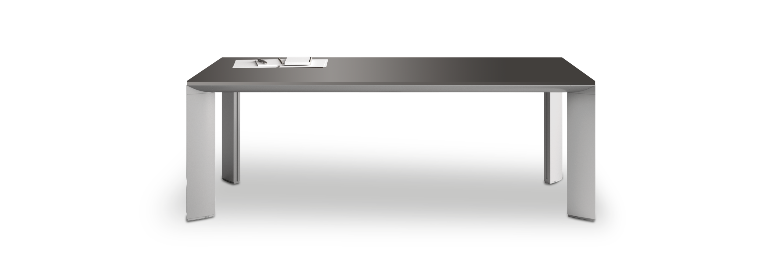 Le superfici uniformi e opache del piano valorizzano la purezza delle geometrie, enfatizzando la linearità della struttura in alluminio. La selezione delle tre varianti neutre laccate realizzano un’immagine professionale, capace di dialogare con ambienti architettonici moderni e spazi direzionali, e le due conformazioni del piano, con bordo regolare o smussato, interpretano due stili differenti: essenziale o raffinato. La struttura, dal design inconfondibile, si inserisce in questo quadro offrendo soluzioni in alluminio verniciato, ma anche rivestite in pelle, per unire design e grande prestigio.